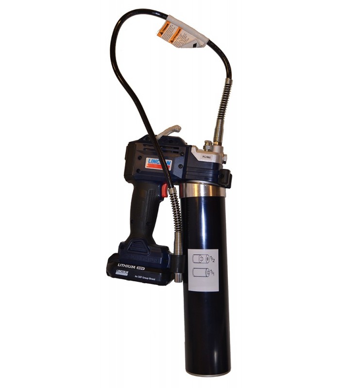 Lincoln batteridriven smörjspruta 20V utrustad med nyutvecklad 1kg fettbehållare (1000 ml) för dig som kräver större mängd fett med dig ut på smörjronden.