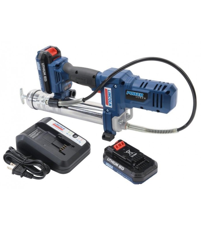 Lincolns nya 12 V batterismörjspruta med Li-Ion batteri. I detta utförandet med 2 batterier.